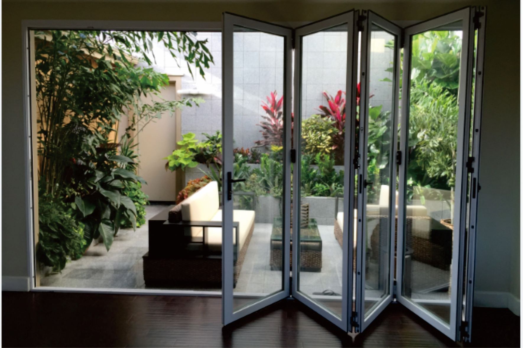 Pintu lipat kaca memberikan kesan modern dan elegan dari suatu bangunan, sering digunakan untuk menambah estetika ruangan serta memberikan kesan luas dan terang.